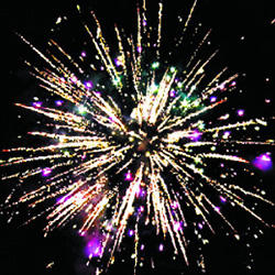 3-4. Выстреливает подряд: Золотые букеты. Серебряные звезды с пышными хвостами (кокос), красно-желтая сфера (пион) и белое мерцание.