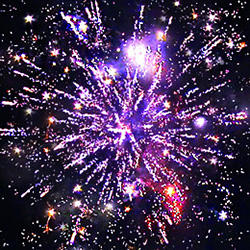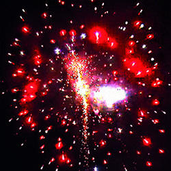 Красные или зеленые или синие звезды с белыми хвостами и белые трещащие искры. Вертушка разрывается облаком трещащих разрывов. Шуршащая комета разрывается красными звездами с белым мерцанием. Белые хвосты с треском. Из шуршащих комет появляются белые разлетающиеся огоньки. Красочная концовка: сфера зеленых звезд и облако трещащих разрывов.