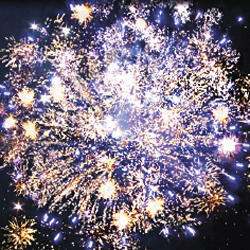 8. ФИНАЛЬНЫЙ ЗАЛП: Фиолетово-синяя сфера (пион), серебряные звезды с пышными трещащими хвостами (трещащий кокос) и облако треска (трещащий дождь).